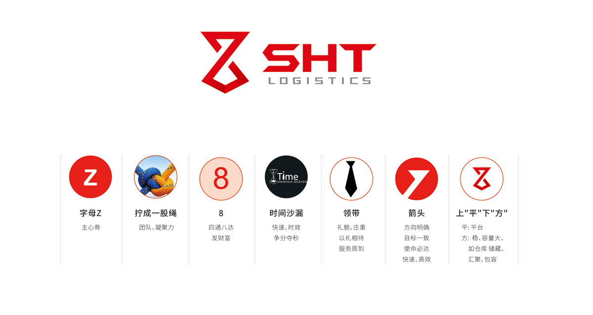 SHT是環海通達國際貨運的品牌商標,品牌設計緊抓行業屬性,從服務,時效性等角度出發進行品牌塑造。logo設計來源于一個時間沙漏的造型,體現物流行業快速高效時效性,領結的造型又喻意了貼心,放心的服務理念。