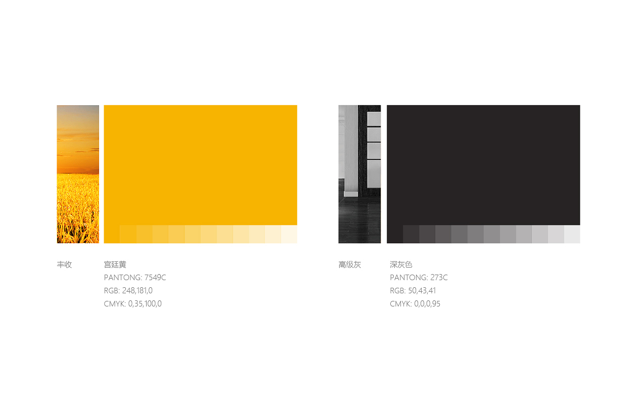 標準色選用代表宮廷與皇家的金黃色為主色,溫暖親和力強,同時也代表成熟和豐收,契合了品牌內涵。