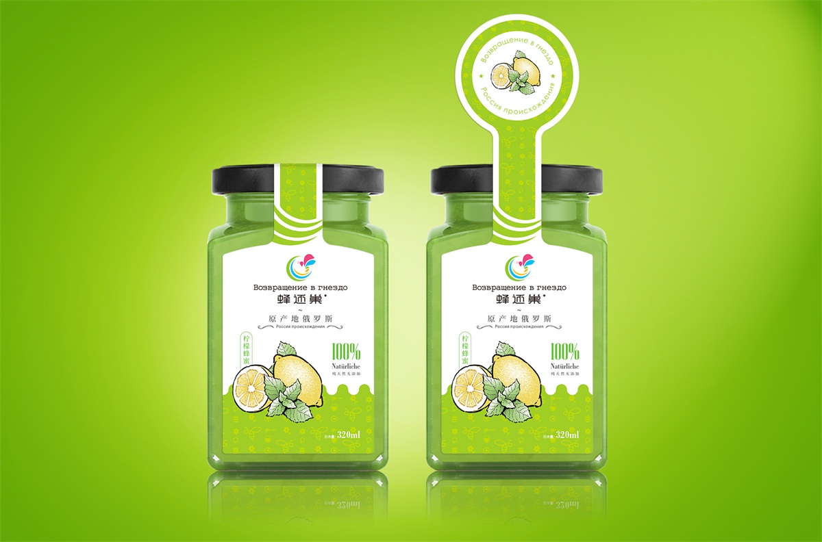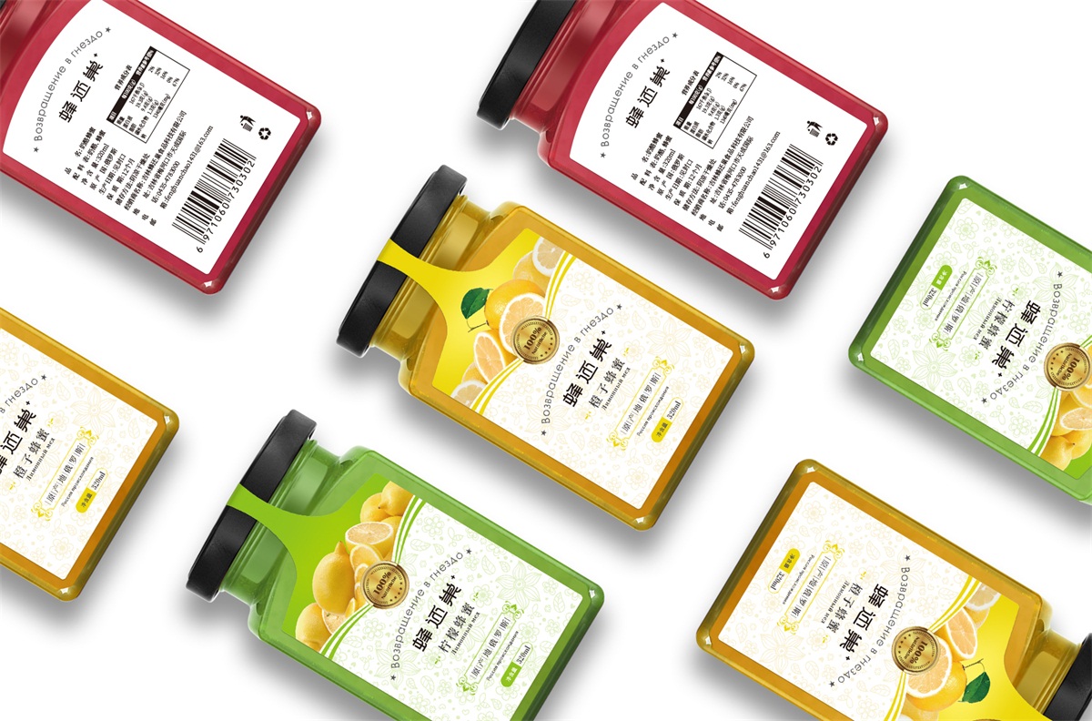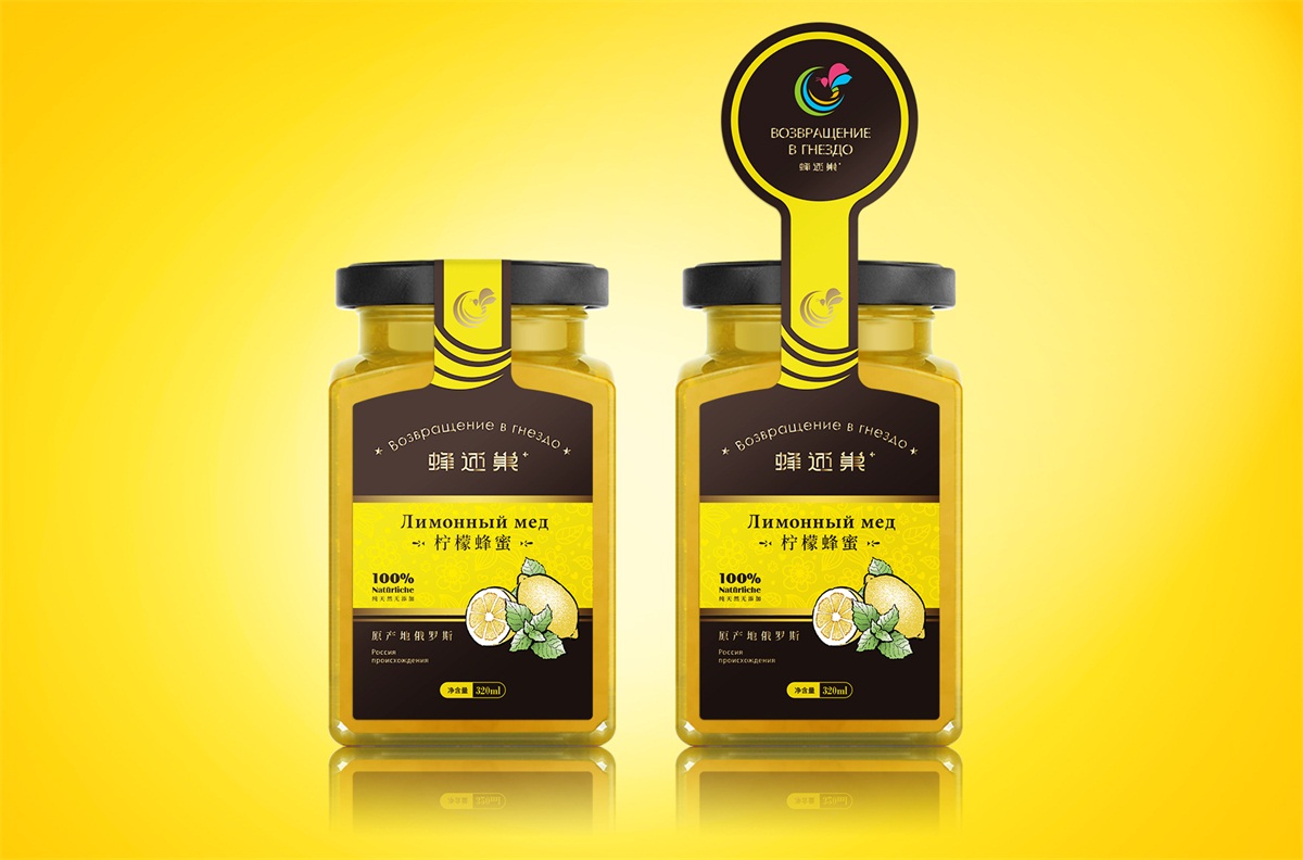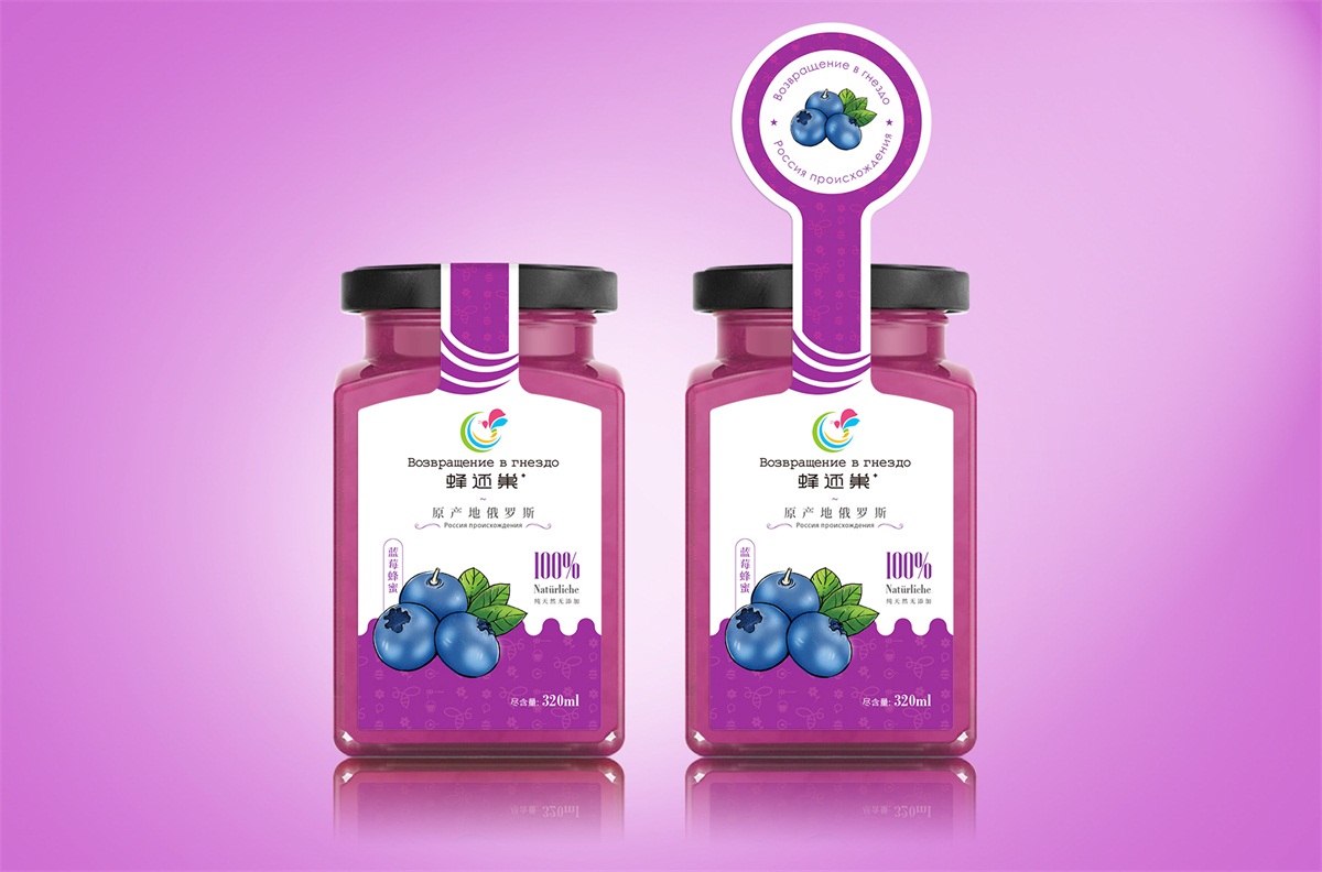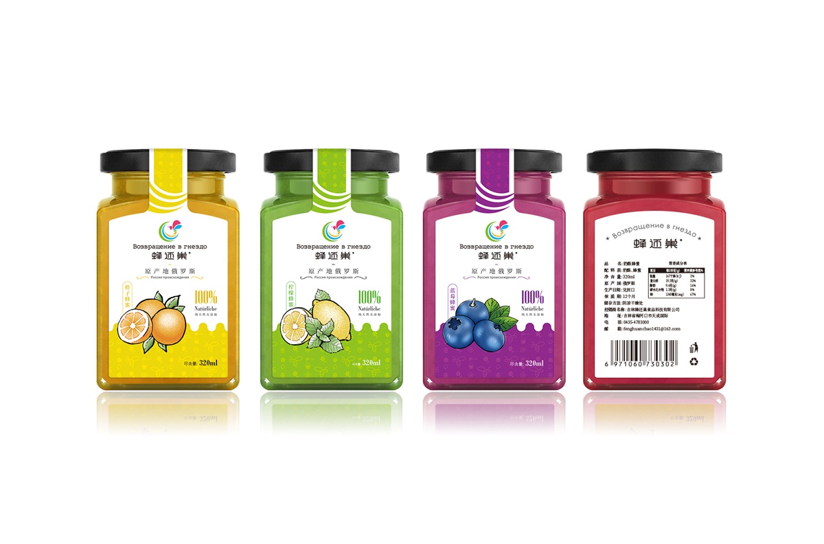 蜂還巢俄羅斯彩色蜂蜜精選天然成熟蜂蜜經多重過濾精制而成,選材考究,天然的彩色蜂蜜本身就獨具差異化,所以這個系列的包裝彩用透明玻璃瓶設計,讓彩色的蜂蜜直接呈現在消費者眼睛,標簽只做口味區分即可,簡單明了。
