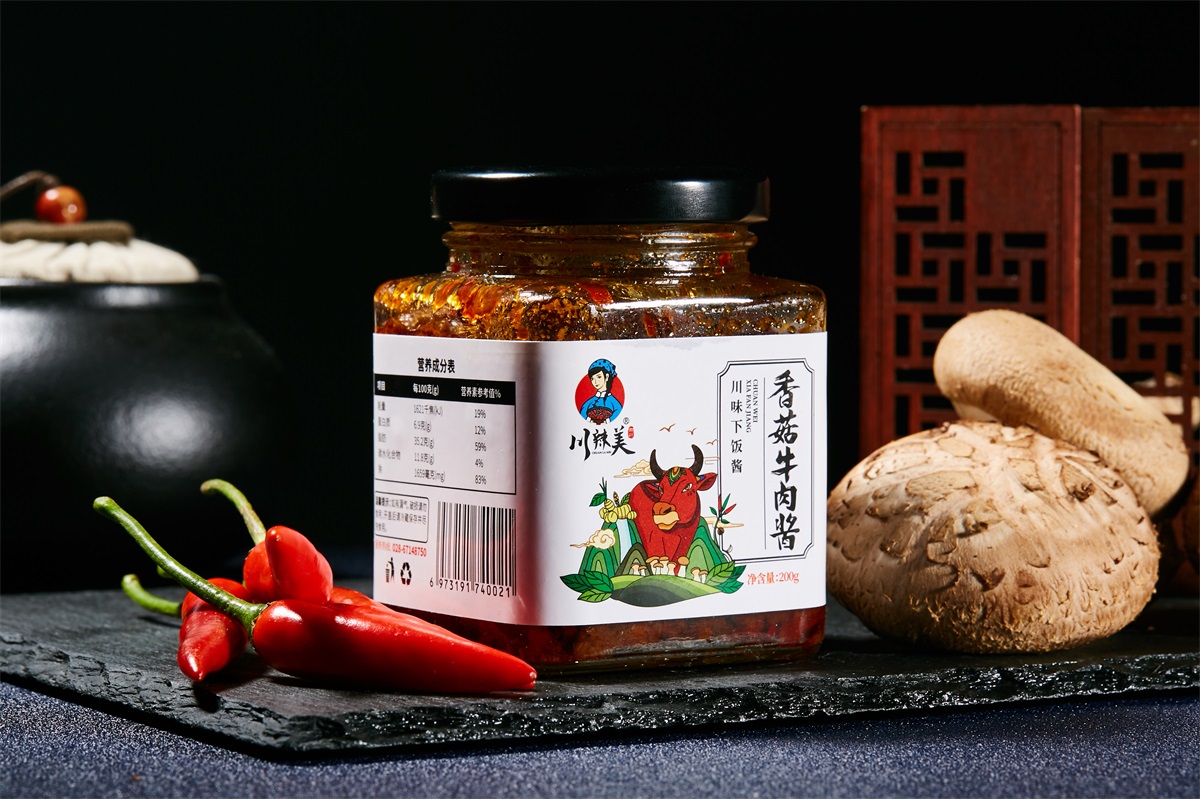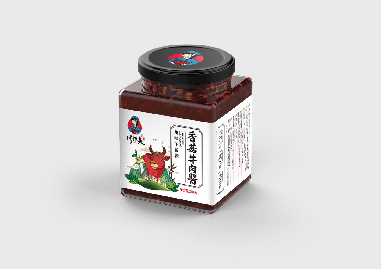 川辣美辣椒醬屬于地方特產類,本方案選用了方形的玻璃瓶+瓶身標簽設計的形式。 來自四川的美味辣椒醬品牌,古風、韻味、親和,從品牌logo設計,包裝瓶的選擇,到系列包裝形象設計,方案將雙椒醬、燒椒醬、香菇醬、香菇牛肉醬四個品類以插畫風格進行創作,以系列感來呈現,品牌感強,接地氣